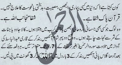 All those suffering from any Physical, Mental and Spiritual illness or black magic, should listen to Surah “Al-Rehman” a recitation by Qari Abdul Basit with out translation three time a day for seven consecutive days with closed eyes and full attentin. Every time after listening take half glass of water. Close eyes and say “Allah” thrice in heart and drink in three sips.